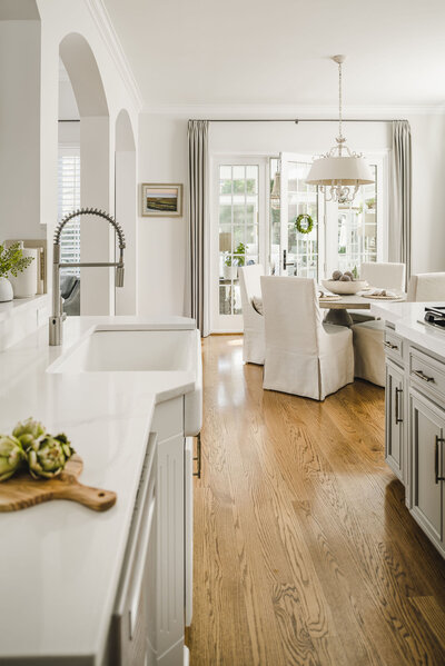 We focused on lightening and brightening this home with outdated paint, cabinetry, and countertops. In the kitchen, we revitalized the space by painting the dark cabinetry white and adding new hardware, appliances, a modern sink, and quartz countertops. The new backsplash complements the existing hardwood flooring, creating a cohesive and refreshed look. Updated lighting fixtures in both the kitchen and breakfast nook enhance the brightness, while window treatments flanking the back patio door add a touch of softness to the breakfast area.